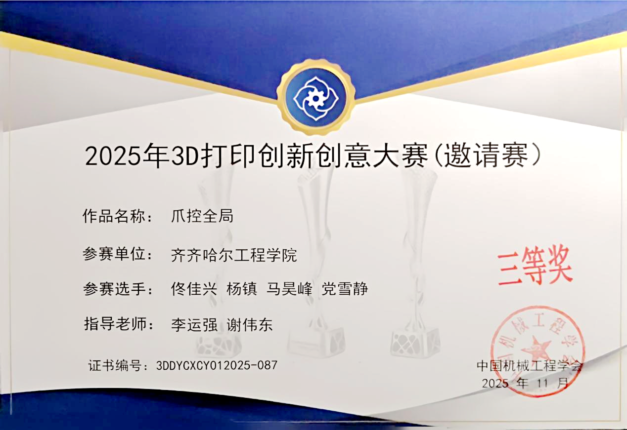 近日,2025年3D打印创新创意大赛全国总决赛在北京国家会议中心圆满落幕。由我校机电学院李运强、谢伟东老师指导,佟佳兴、杨镇、马昊峰、党雪静四名同学组成的“爪控全局”团队首次参赛且表现出色。他们凭借创新的设计方案与精彩的现场答辩,最终荣获全国总决赛三等奖,为学校赢得了荣誉。2025年3D打印创新创意大赛是中国3D打印领域的新锐高端赛事,是中国机械工程学会在增材制造领域的重要布局之一。本次全国总决赛由中国机...