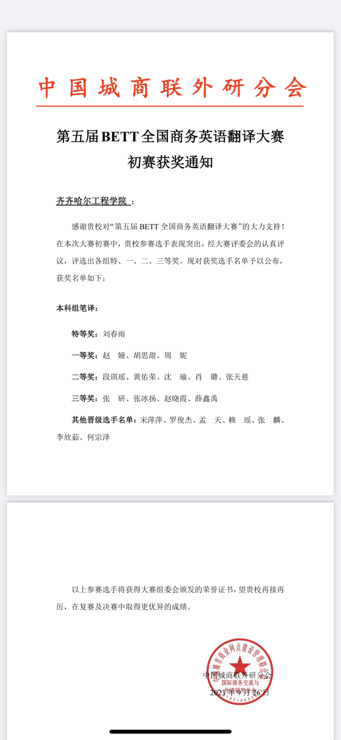 近日,第五届BETT全国商务英语翻译大赛初赛结束。我校管理工程系英语专业师生全力备战,13名学生在本科笔译组获奖,英语201刘春雨同获本科组笔译特等奖;赵娅等同学获一等奖;段琪瑶等同学获二等奖;张妍等同学获三等奖。第五届BETT全国商务英语翻译大赛组委会由中国城商联外研分会联合众多协办单位组建。齐齐哈尔工程学院作为本次大赛赛点,参赛学生于9月23日在二号教学区统一参加线上闭卷初试。自今年9月初备赛以来,学生根据...