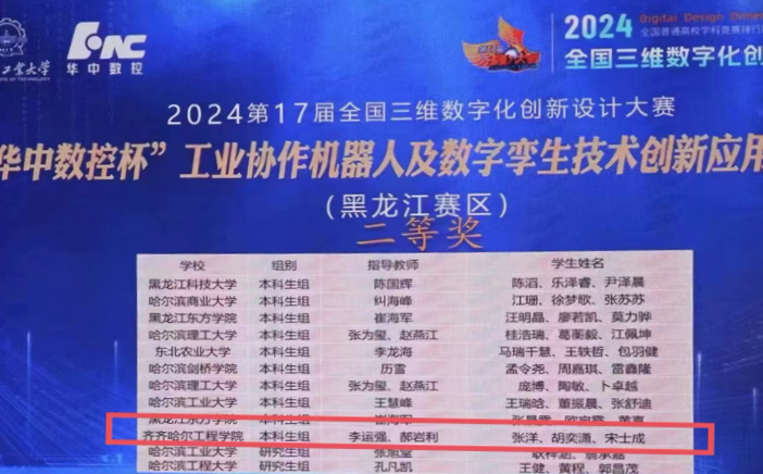 7月13日,第17届全国三维数字化创新设计大赛“华中数控杯”黑龙江赛区决赛传来喜讯,我校机电工程系机械设计制造及其自动化专业学生张洋、胡亦潇、宋士成团队荣获二等奖;王重阳、高月童、刘正杨团队及刘展、刘麟松、董思彤团队分别荣获三等奖。该项赛事隶属于全国大学生学科竞赛56项赛事之一,本届比赛由黑龙江省普通高等学校创新创业教育指导委员会主办,于 7月 12 日至 13日,在哈尔滨工业大学举办。下一步,机电工程系将...