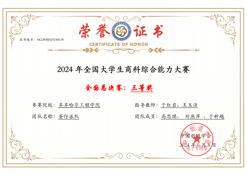 近日,2024年全国大学生商科综合能力大赛正式落幕。我校管理工程系互联网金融专业两组学生团队获得了国赛“三等奖”的好成绩。全国大学生商科综合能力大赛由中国创造学会主办,中南大学商学院、上海策鸿信息科技有限公司、中国创造学会青年工作委员会协办,旨在促进各高校商科教学的改革与发展,进一步提升各院校的商科教学水平和新商科人才培养质量,提高同学创新、创业、创造能力,为高校毕业生成长、成才,成功就业提供帮助...