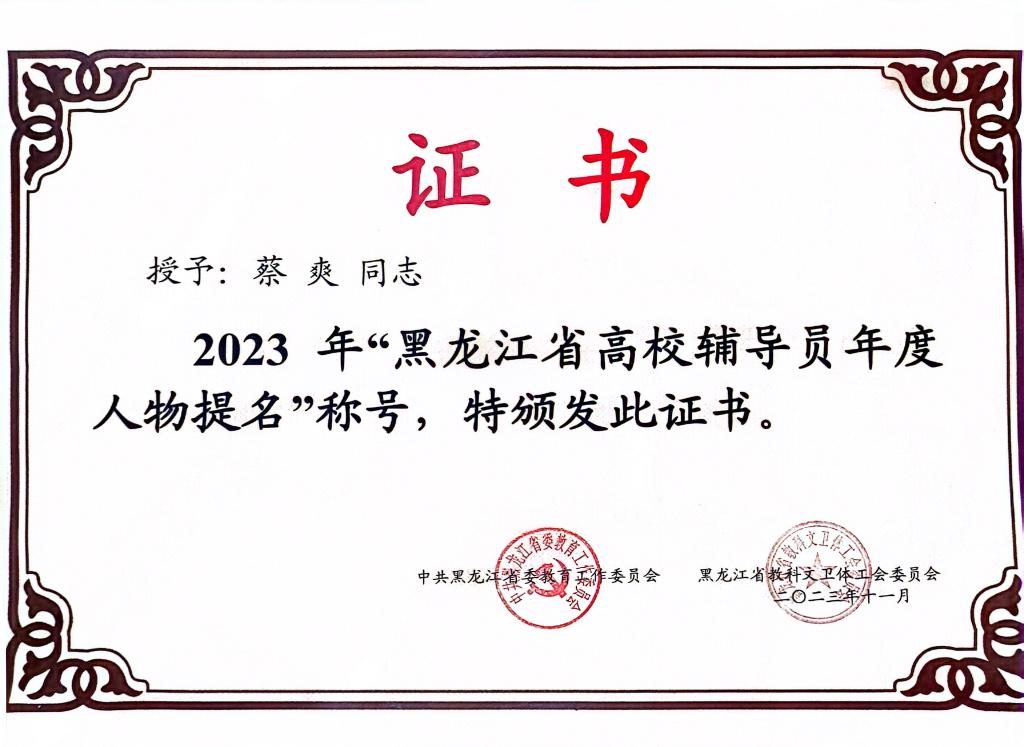 作为高校辅导员,她服务于青年学生成长成才,积极推进大学生素质教育,不断研究新情况、解决新问题、开拓新领域,在思想政治教育、校园文化建设、社会实践锻炼、青年志愿活动、就业创业服务等方面取得了显著成绩,在维护学校安全稳定和促进学校科学发展中贡献力量。其所带的学生曾先后荣获国家奖学金,国家励志奖学金及黑龙江省三好学生等荣誉;在创新创业方面,她更是学生的人生导师,曾先后带领学生开展科研课题研究,积极协助专业进行课程建设,真正做到育人有实效。