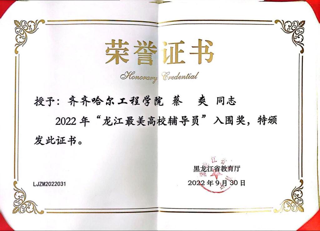 2022年被评为第六届全国民办高校“优秀辅导员”、同年9月荣获“龙江最美高校辅导员”荣誉称号;参加工作以来,多次荣获学校“优秀教育工作者”“优秀共产党员”“先进党务工作者”荣誉称号,其所带领的支部被评为“先进基层党组织”。2023年荣获“黑龙江省高校辅导员年度人物提名”。