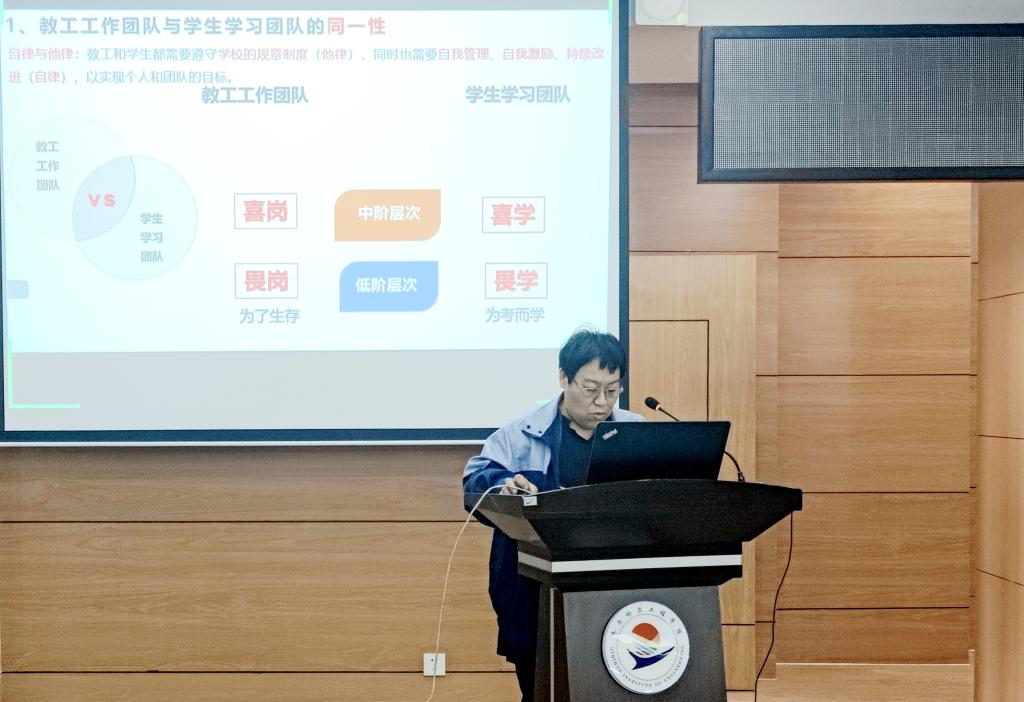 汇报中,学校相关部门共分为五组,采用双抽的方式,现场抽签确定汇报顺序和汇报人。汇报人代表所在组,结合工作实际,从教育家精神和自律、他律角度分析在学校学习型组织建设中,教工工作团队与学生学习团队的同一性和差异性,并总结为两个团队的同一性都是基于集体主义精神的团结协作、共同进步。