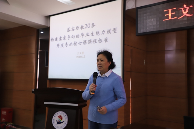 培训由蒋春艳副院长主持。王文槿教授首先为全体参训教师作《构建需求导向的毕业生能力模型,开发专业核心课程标准》专题讲座,指出人才培养要定方向、定标准、定课程,系统介绍了如何进行人才培养的准确定位,强调树立能力导向观念,严把底线毕业标准,通过构建毕业生能力模型来建立毕业生能力和课程之间的关系,并给出开发课程标准的基本步骤以及开发能力模型和课程标准的适用范围。