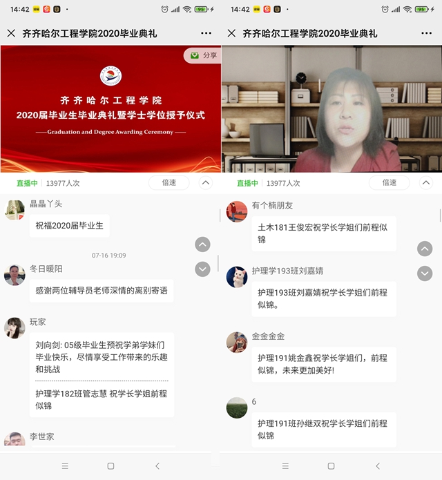 毕业生家长代表、机电工程系机械本161班安东家长在线上发言中,感谢学校领导、老师对孩子大学四年思想、生活、学习上的培养与教育,希望孩子们在离开校园,走向社会之际,牢记学校“中而至庸,和而不同”的校训,永葆勤奋好学、奋发有为的精神状态,更好地服务社会。
