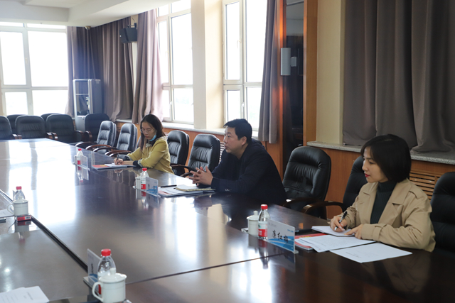 在图书馆603会议室,市产教融合发展中心工作人员曹宇、廉红梅、李思洋与副院长张振笋,继续教育部主任、东亚技职校校长郭磊,学生发展中心负责人康静,教务处副处长杨静霞进行座谈交流。