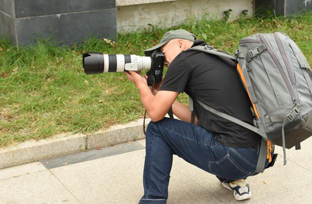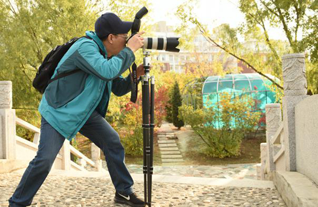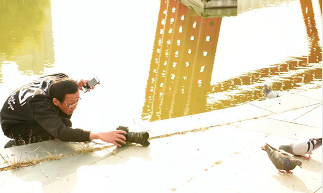许老师对前来的摄影老师给予点赞,宋燕军在拍摄的时候始终背着一个重20多斤的双肩包儿,却乐此不疲奔走拍摄;黄洋为了拍好鸽子在地面吃食儿的镜头,自己躲在易湖边儿台阶下,把单反相机放在地上拍,既认真又有办法!