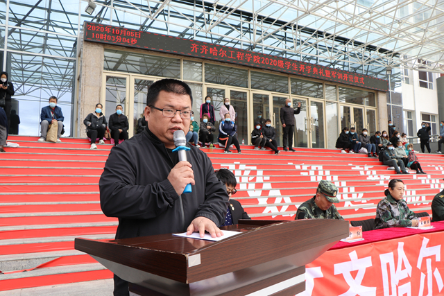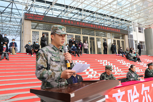 张振笋副院长首先宣读《齐齐哈尔工程学院2020级学生军事训练工作实施方案》,明确军训指导思想和军训意义,对军训考核及成绩记载、军训总结与表彰做出安排,从“各部门要高度重视,各司其职,各尽其责”“坚持预防为主,切实将安全工作放在首位”“加强课余时间管理,严格请假和销假制度”等六个方面提出具体要求。