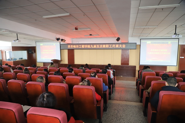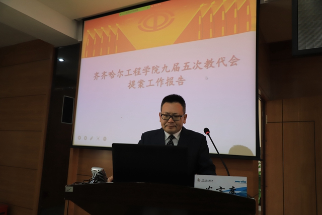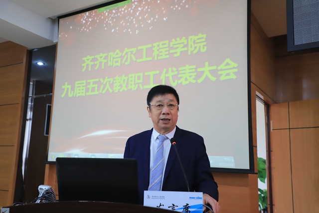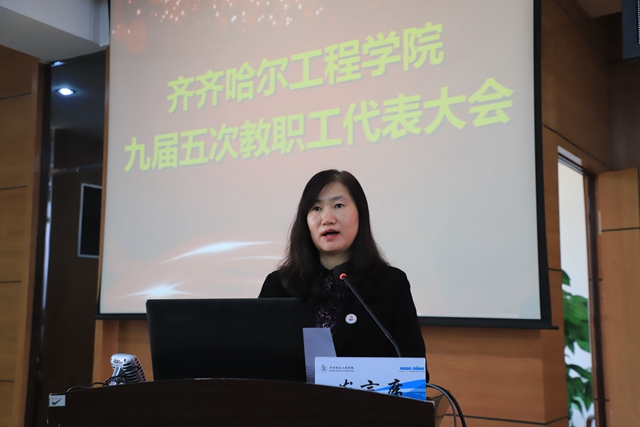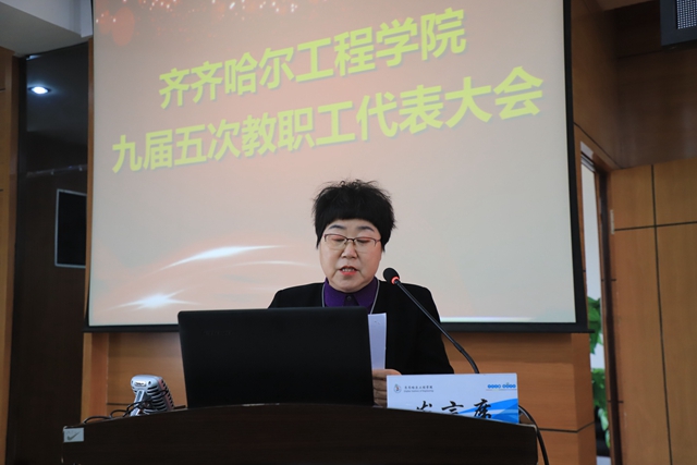 蒋春艳副院长宣读《齐齐哈尔工程学院第九届教职工代表大会第五次会议决议》,决议指出,本次会议是在学校迎接“十四五”新阶段,践行新理念,开创发展新格局的关键时期召开的一次重要会议。学校顺利通过教育部普通高等学校本科教学工作合格评估之后进入新阶段,要求全体教职工要统一思想、开拓思路,有新作为,以高度的主人翁责任感和使命感,认真理解报告的内涵,学习贯彻本次教代会精神,为创建百年老校而努力奋斗!