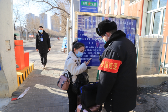 保卫处把好进出口关,做到守土有责,为了迎接学生返校,保卫处组织人员对南门岗、北门岗卫生进行了大清扫。为了充实安保力量,保障师生安全,保卫处于3月初,新招聘了3名校警。明确了各门岗迎接学生返校流程。为了规范学生入校测温、扫码时,排队等候保持适当的距离,保卫处购买了30条“一米等候线”,分别贴在南门和北门地面,并印制了新的“健康码”。为了落实消毒工作,分别为图书馆二楼大厅、南门岗、北门岗配备了自动手消仪、脚消专用消毒垫及消毒液专用喷壶。为图书馆两部电梯配备了印有“星期一至星期日”新地毯,每天更换、温馨提示。返校期间,学生依次按照一米线标识,经扫描龙江健康码和测温后有序进入校园报到。