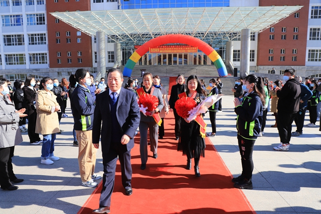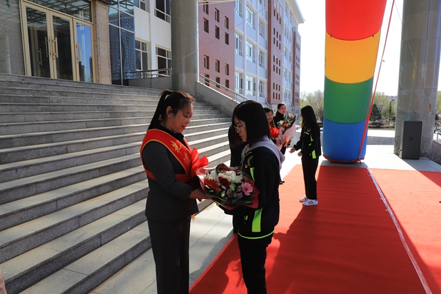 学生代表向市先进集体代表冯伟和市劳动模范张静献上鲜花。两位老师在热烈的锣鼓声中,带着全校师生的祝福和期待前往齐市工人文化宫,参加齐齐哈尔市第三十四届劳动模范表彰大会。