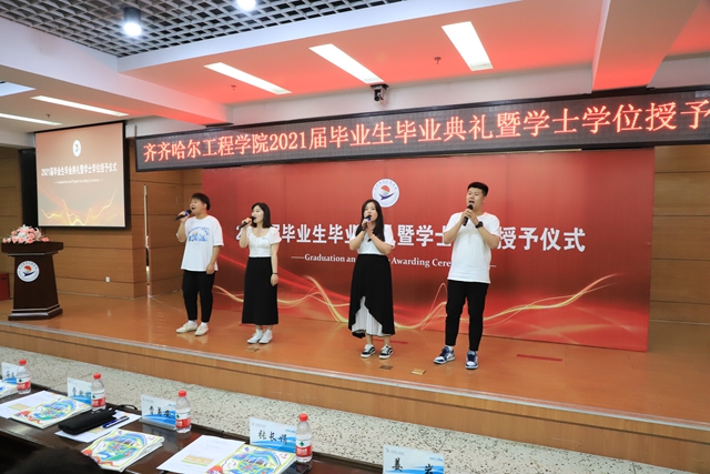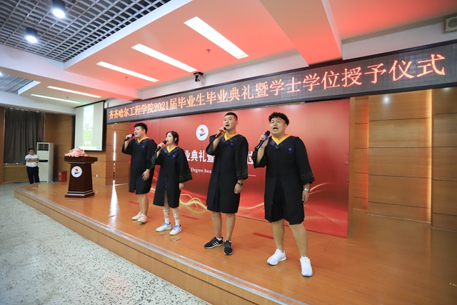 典礼过程中,全体毕业生共同合唱歌曲《再见》,用歌声回忆大学的种种美好,表达对母校依依不舍的眷恋之情。在学校各个岗位辛勤工作的教工代表通过视频,对2021届毕业生进行了祝福及寄语。
