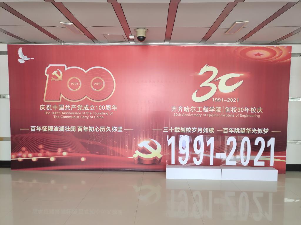 图书馆门前的电子屏幕上,推送着祝福的标语:“庆祝齐齐哈尔工程学院创校三十年,致敬奋斗者!”、“三十载创校岁月如歌 一百年眺望华光似梦”等。