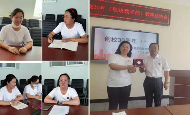 座谈会上,思政教学部负责人魏军结合自己27年的在校经历,讲故事,谈变化,字字倾情,句句入心,感慨30年来学校艰苦奋斗的历程和辉煌成就。李娜老师回忆了自己从2007年入校就职以来的经历。她表示随着一路走来身份的转变,在工作、生活中都有了许多收获,同时也有幸见证了学院的发展。感谢学院给予每一个岗位,为自己搭建的每一个平台,在学院今后的发展道路上,要不断提升自我,贡献力量。邵奇老师表达了自己工作以来的喜悦和感动。2016年刚入校,在经历了助课、听课、备课、讲课的过程,不断地成长起来。五年来,通过了解学校的发展历程、办学理念,对教改之路有了更深的认知和体会。赵婷婷老师从角色转变、工作经历、在线教学等方面讲述了自己的成长经历,感谢学校所搭建的成长平台,表示要保持做一名合格思政课教师的初心,悉心关爱学生,认真做好教学工作。马琳老师回忆来校5年来,从助教成长为骨干教师,从教师成长为课程负责人,在学院的平台上收获了事业的成功,磨练了意志和性格。都鑫羽老师作为一名新教师,表示从开始工作时的忐忑,到如今各项工作有条不紊地开展,幸运的是有学校领导和许多老师的关心帮助。
