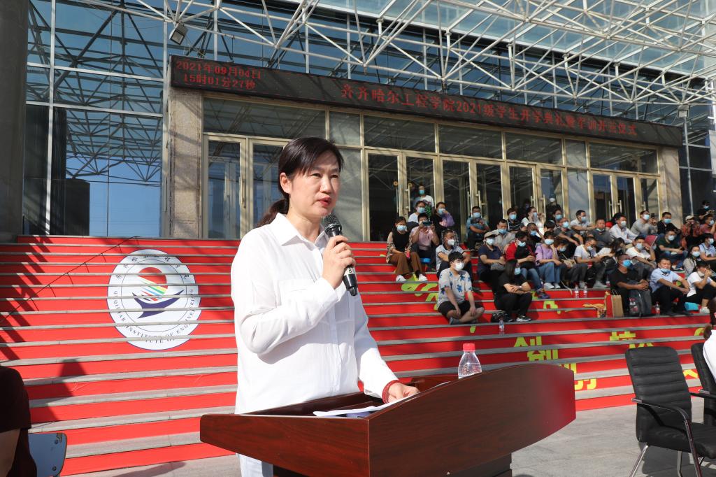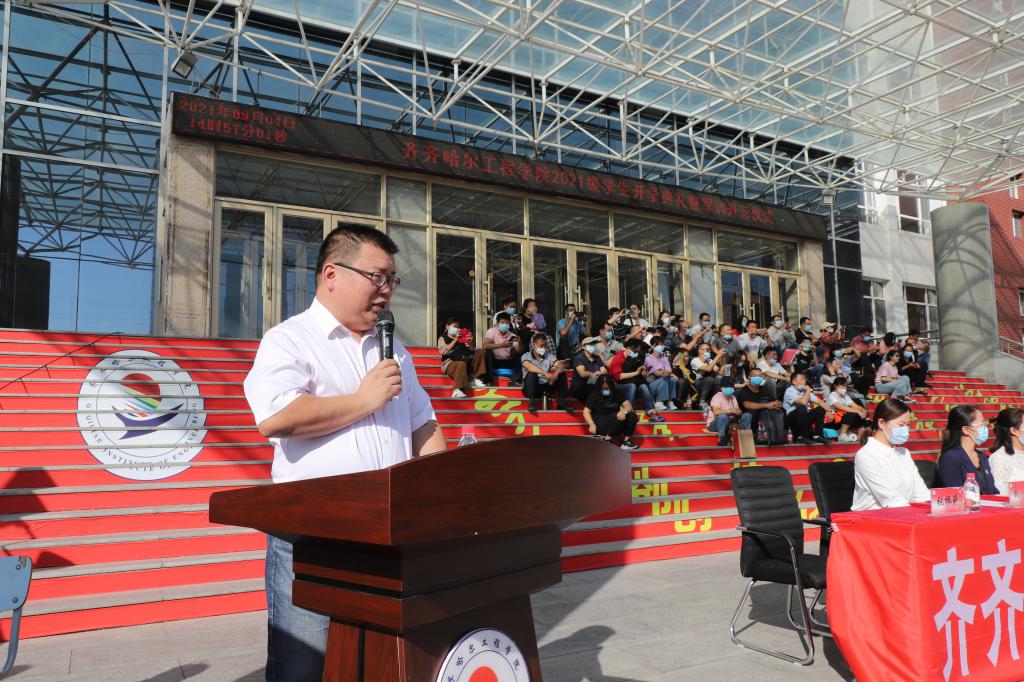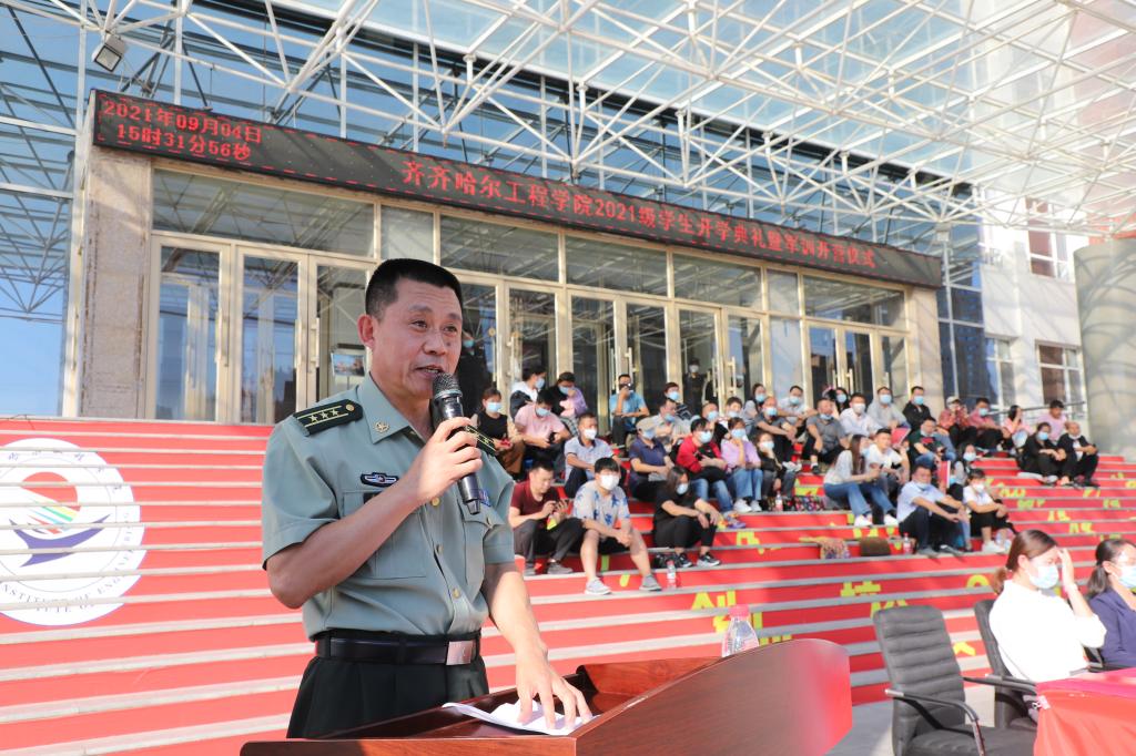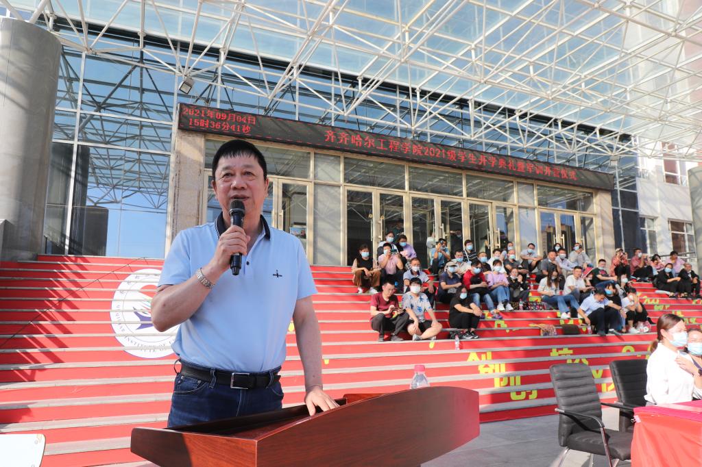 创校校长曹勇安理事长在仪式上代表学校向全体新生表示热烈欢迎,他回顾创校30年历程。指出,今天的校园文化就是明天的社会风气,选择一所学校就是选择一种文化。同学们选择齐齐哈尔工程学院,就是选择了一种创业文化。校园文化里“雕塑”飞机、大炮、坦克是隐性课程,希望同学们在军旅文化熏陶中成为一名战士,养成“亮剑”精神,今后走向社会可以勇往直前。