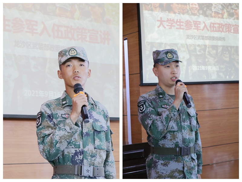退伍返校复学的王昊、李承强两位同学现身说法,生动讲述了自己在部队的磨砺、所得所获,认为奋斗的青春最美丽,鼓励学弟学妹投身军营,为祖国建设贡献力量。