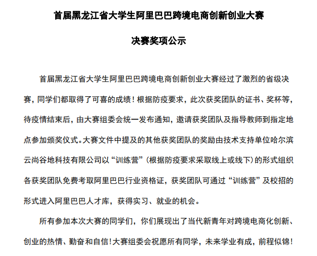 12月20日,由黑龙江省普通高等学校创新创业教育指导委员会主办,黑龙江省教育厅、阿里巴巴有限公司、黑龙江科技大学承办的“首届黑龙江省大学生阿里巴巴跨境电商创新创业大赛”成绩揭晓,我校管理工程系电子商务与英语跨专业团队荣获本届大赛两项二等奖的佳绩。