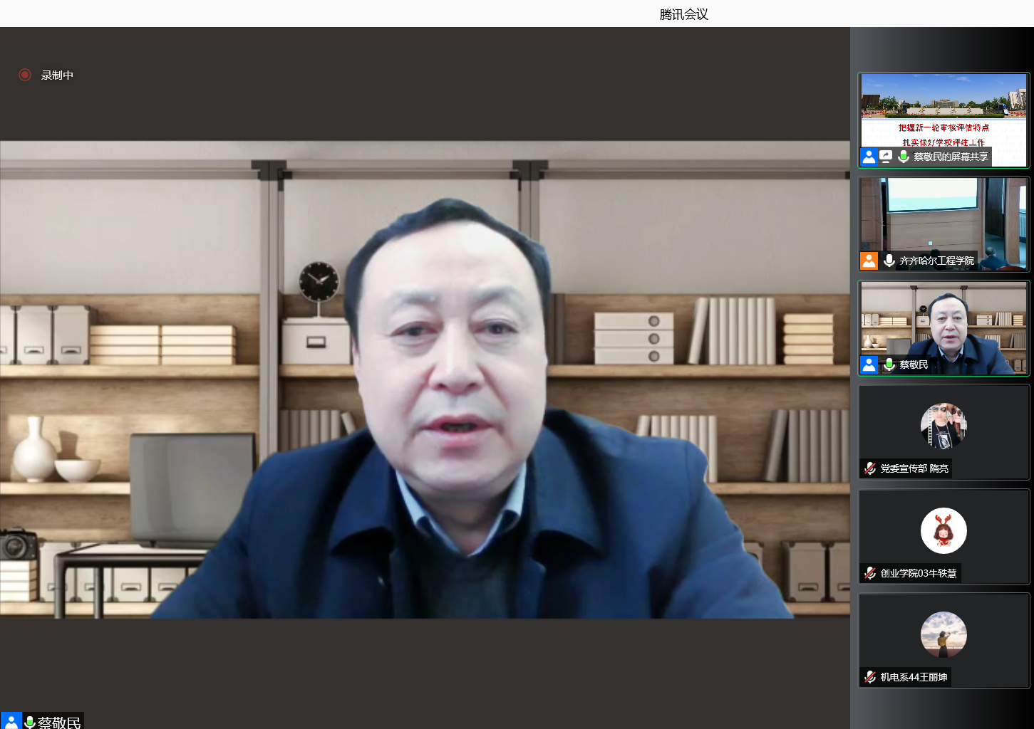 蔡敬民书记从新一轮审核评估六个突出特点、新一轮审核评估试点工作介绍、新一轮审核评估的申请与自评、新一轮审核评估的入校与整改四个方面开展讲座。