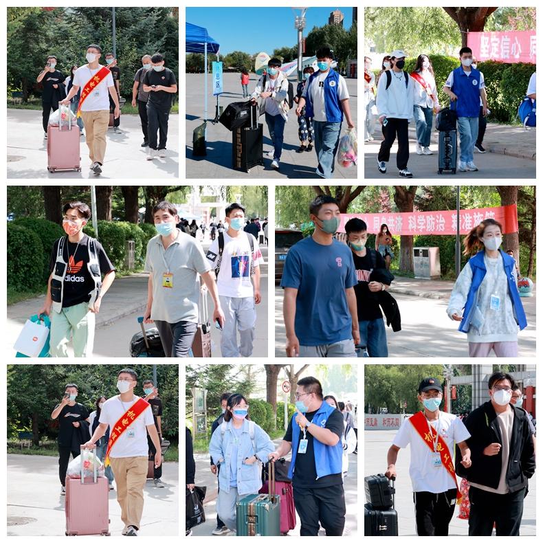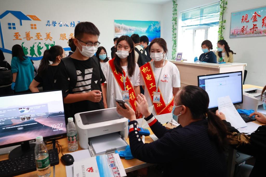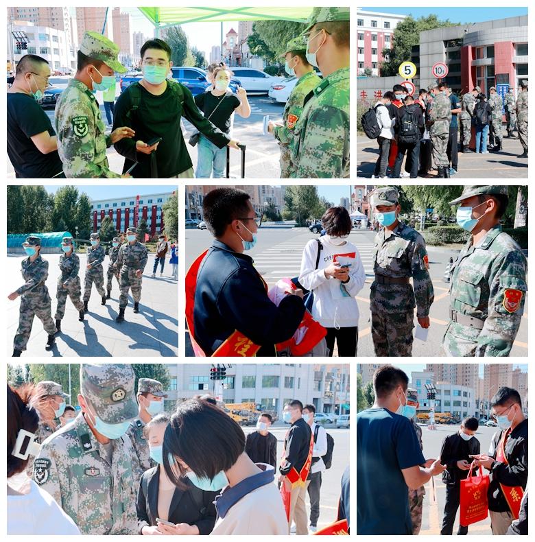 学校严格落实疫情防控要求,在校门口,学长教官团对新生及家长扫码测温,查验大数据行程码和龙江健康码绿码以及48小时核酸报告。