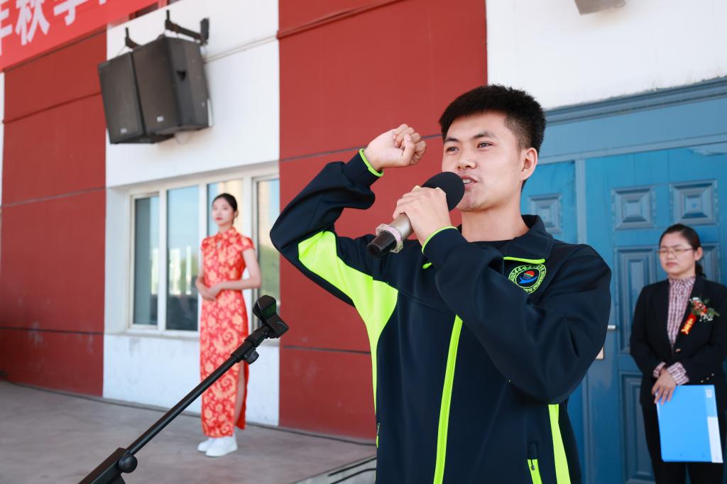 学生雷鸣代表全体运动员庄严宣誓:将以积极、饱满、热情的态度参加运动会,赛出强健体魄,赛出良好体育道德风尚。