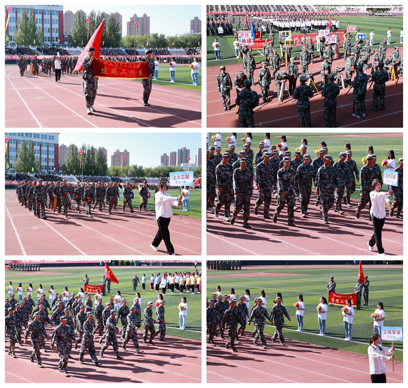 伴随着雄壮激昂的《运动员进行曲》,由国旗方队、教官方队、校旗方队、标语牌方队、红旗方队、花束方队、彩球方队、裁判员方队、教工方队、各系方队组成的37个代表队迈着整齐的步伐,迎着初升的朝阳,带着灿烂的笑容依次通过主席台,接受检阅。他们英姿飒爽、口号嘹亮,展现了团结奋进、昂扬向上的精神风貌,表达了全体师生对体育运动的热爱之情和对党的二十大胜利召开的美好祝愿。