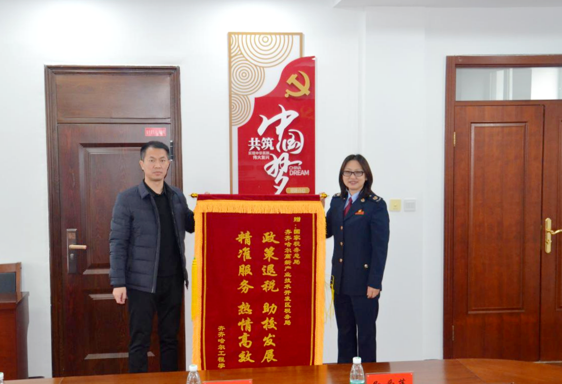 11月11日,齐齐哈尔工程学院党委书记郭伟东、工会主席、总会计师姜岩带队将一面写着“政策退税,助校发展;精准服务,热情高效”的鲜红锦旗送到齐齐哈尔高新产业技术开发区税务局局长谷学超手中。