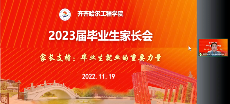 11月19日19时,学校2023届毕业生“云”家长会在线举办,6100多位家长,学校各专业教师、生涯导师、辅导员等在线参加。学生发展中心徐立志主持会议。