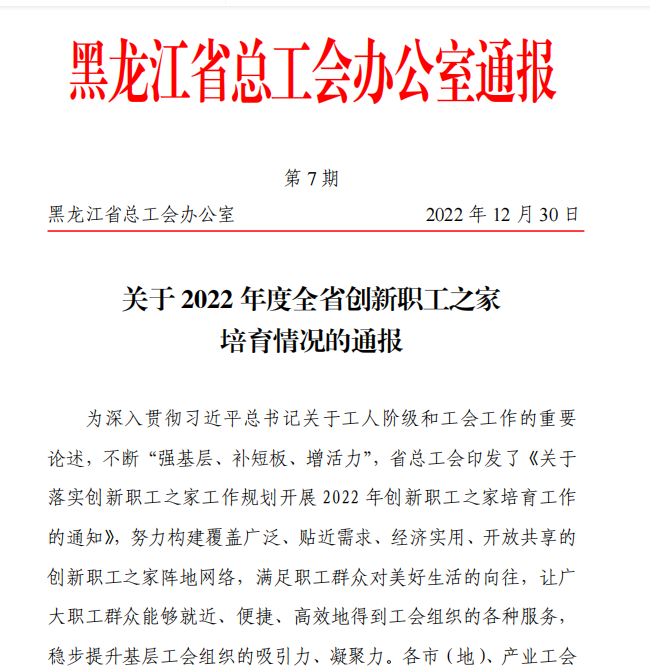 省总工会为满足职工群众对美好生活的向往,让广大职工群众能够就近、便捷、高效地得到工会组织的各种服务,稳步提升基层工会组织的吸引力、凝聚力,审核确定了550个基层工会为2022年度全省创新职工之家培育对象,其中特色职工之家168个,齐齐哈尔工程学院工会榜上有名。