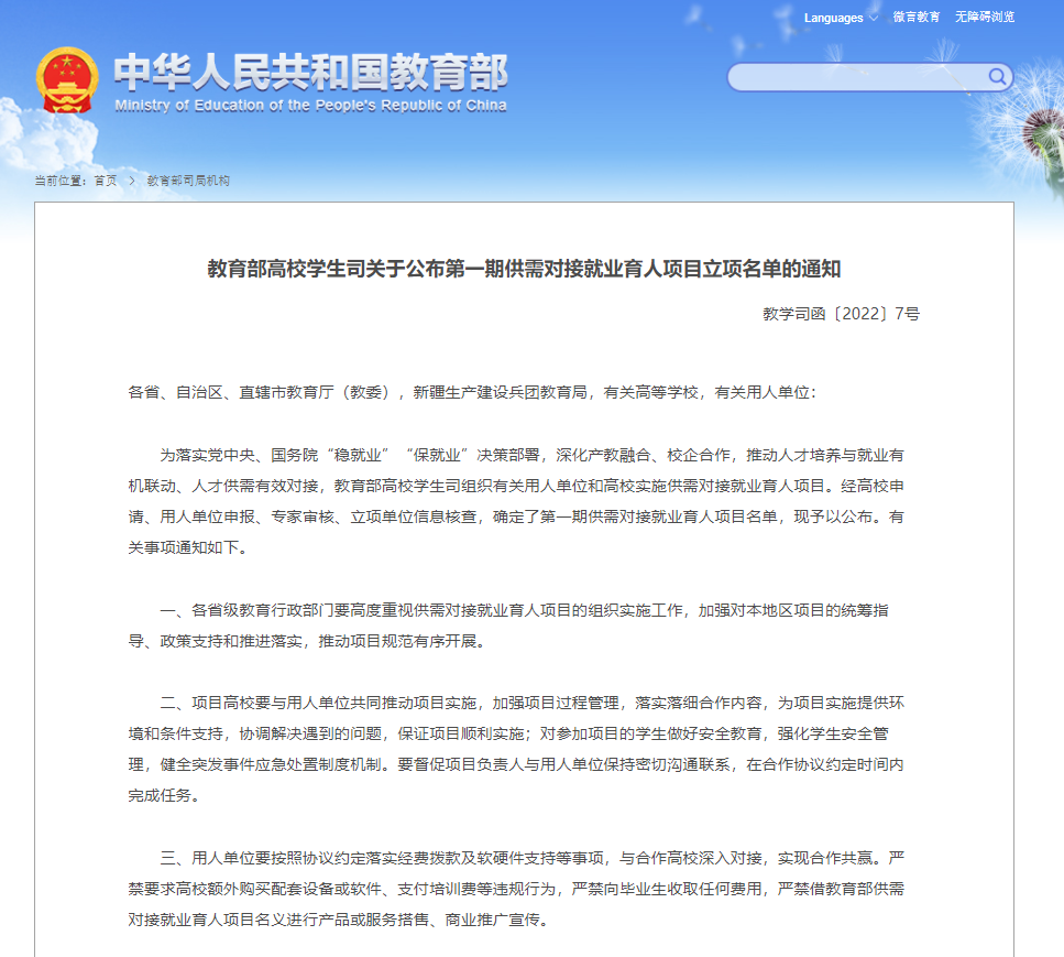 学校此次入选的教育部第一期供需对接就业育人项目,是贯彻落实党中央、国务院“稳就业”“保就业”决策部署,深化产教融合、校企合作的实际行动,为推动学校人才培养与就业奠定了基础。