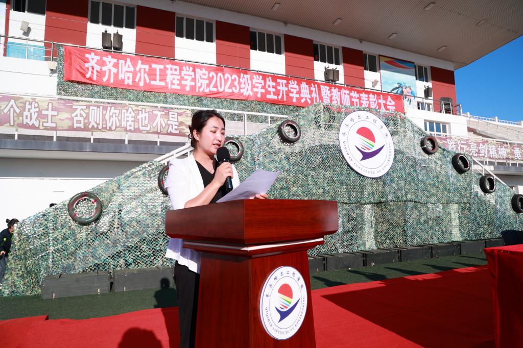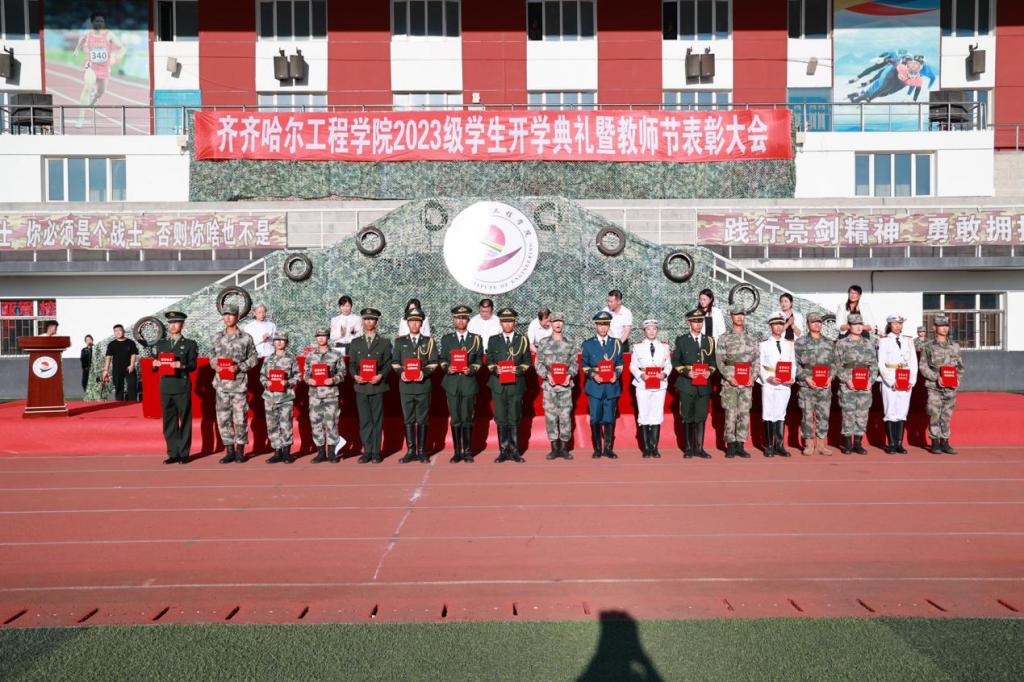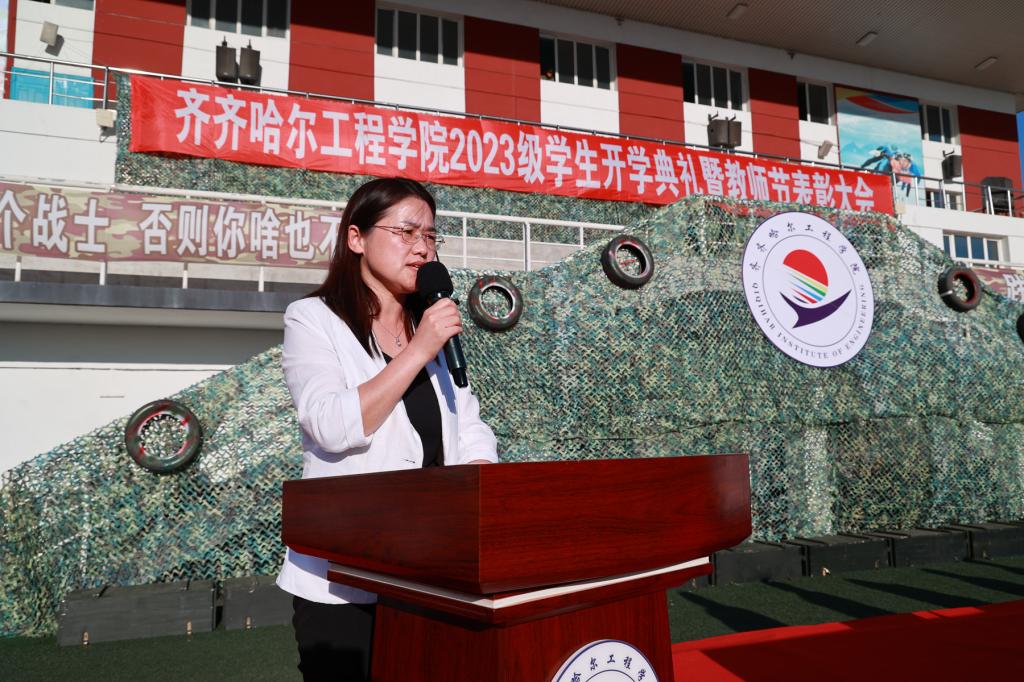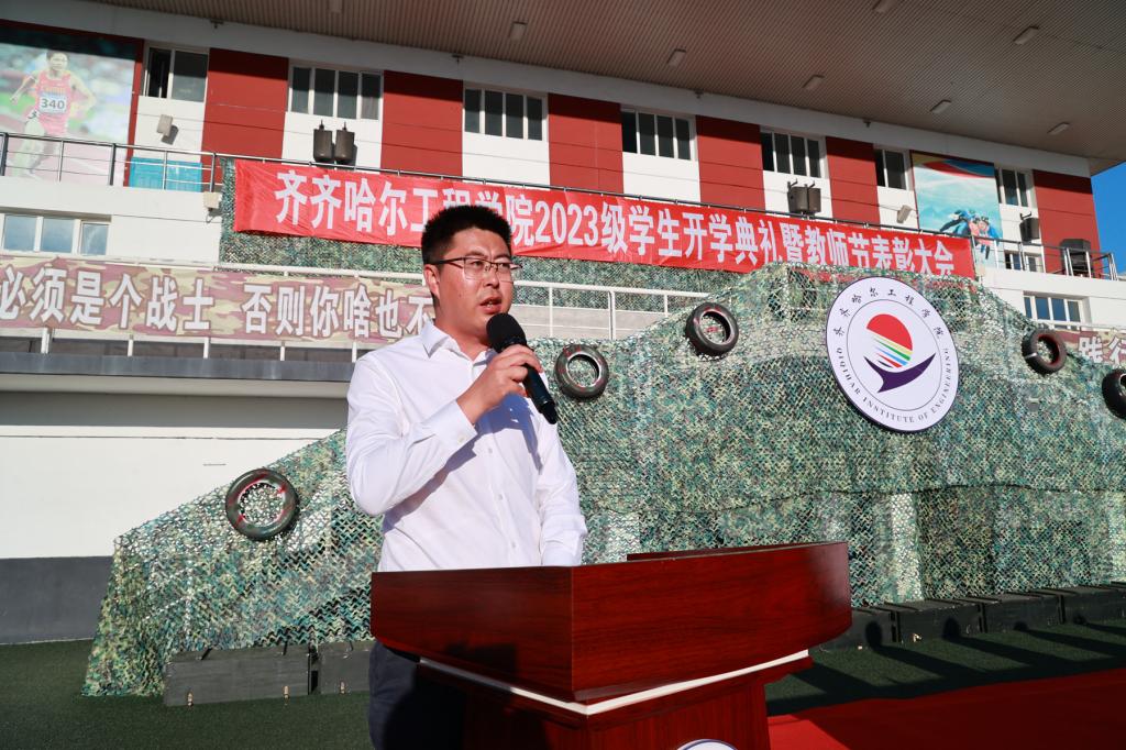 院长曹然彬在会上发表讲话,曹院长对学生军训成果做出了高度评价,充分肯定同学们在军训汇演中的精神风貌。阐释齐齐哈尔工程学院鲜明办学特色:学校是一所创业型的大学,师生共同创业;学校是一所“全员皆教、人人皆师”的学校,生涯导师制陪伴始终;学校倡导“亮剑精神”,希望同学们勇往直前,做最好的自己。曹院长回顾学校32年创业历程,高度评价学校“奋发向上、敢于亮剑”的精神,问候学校教师们教师节快乐,祝福教师生活幸福。