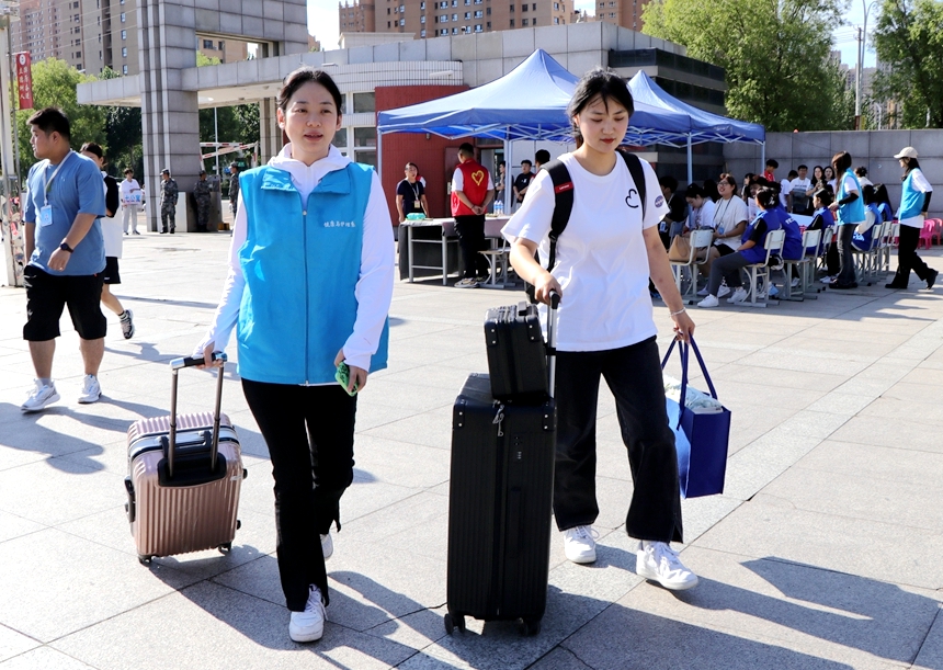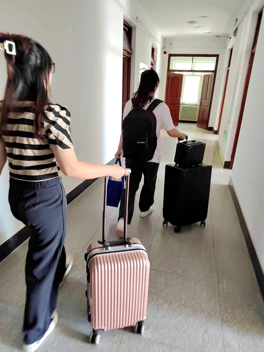 穿蓝马甲的健康与护理系学姐迎上去接过一个拉杆箱。
