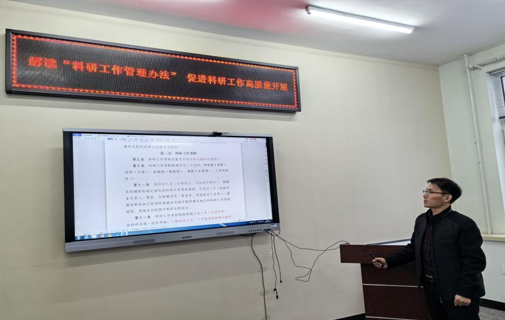 宋庆永老师主要以最新修订的《齐齐哈尔工程学院科研工作管理办法》的文件内容进行详细讲解,帮助教师厘清科研统计、科研奖励、科研考核等相关内涵,又重点强调了在论文发表、各类各级课题申报与界定、科研经费管理、科研考核细则等几大方面的注意事项,并强调各位老师一定要以诚实守信、严谨细致的态度对待每一项科研工作。