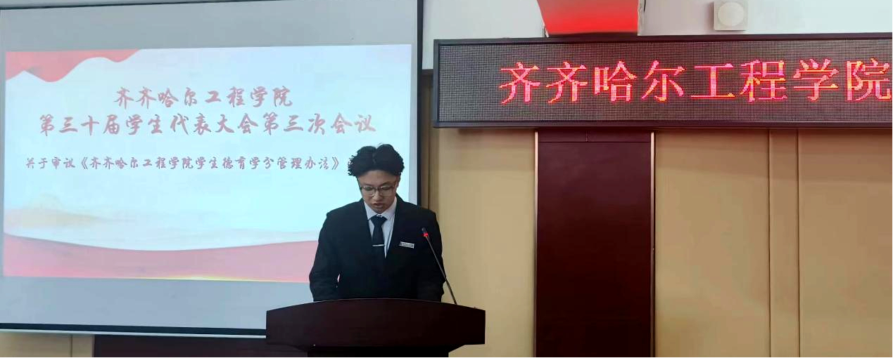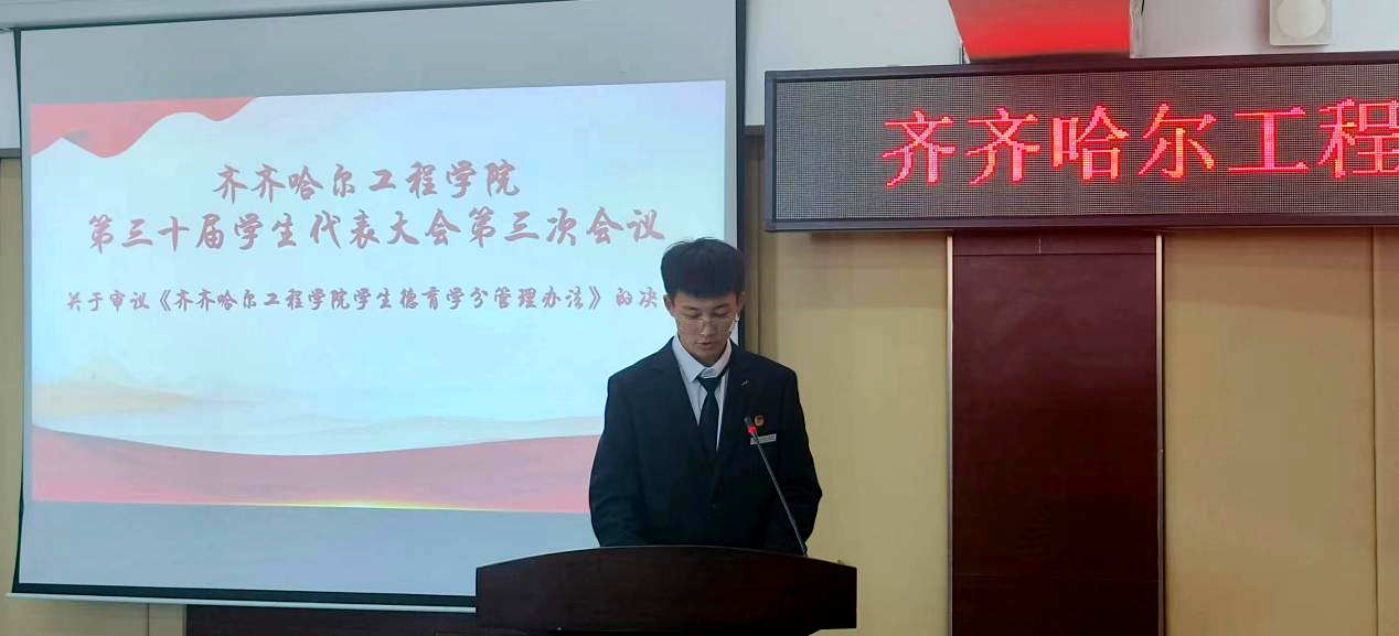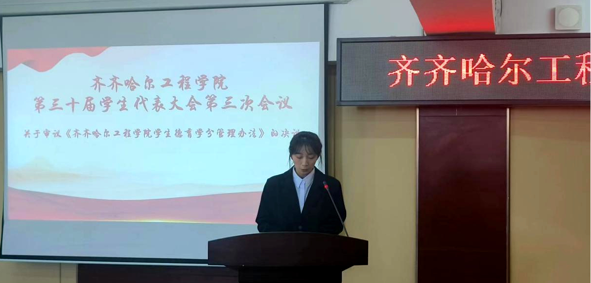 进行现场表决。随后,第三十届学生会常务主席房芯仪宣读关于《齐齐哈尔工程学院学生德育学分管理办法》决议。
