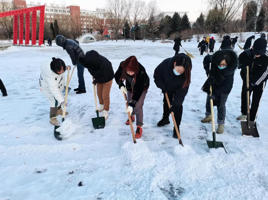 基础部党支部志愿服务活动在冰面举行。为践行使命、彰显担当,优化冰雪运动环境、保障冰上活动顺利开展,基础部党支部书记程薇薇带领支部全体党员教师开展“易湖”冰场清雪志愿活动。