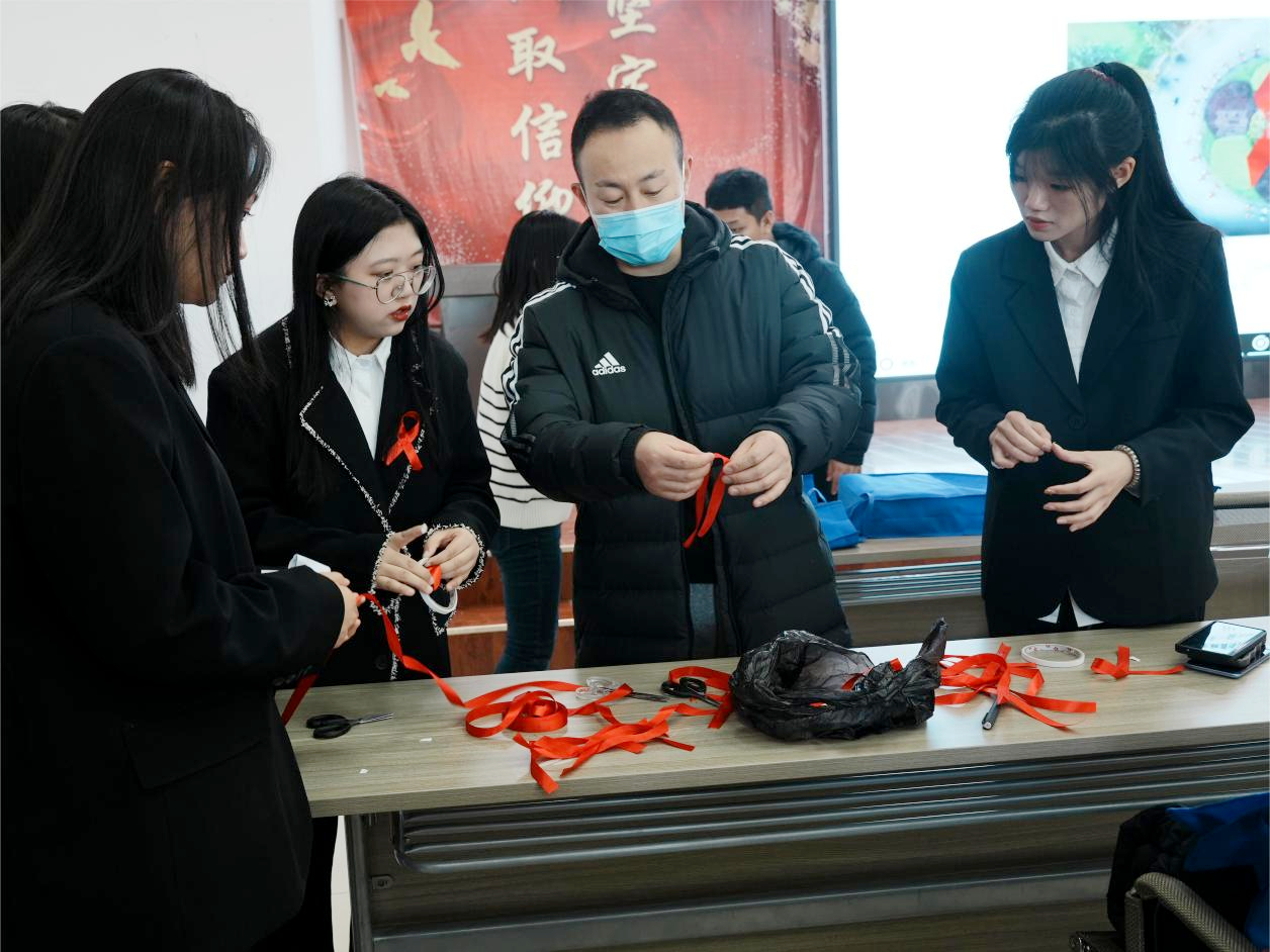 团干部为学生发放材料制作“红丝带”,王力刚老师讲述“红丝带”所代表的意义,使学生更深入地了解到预防艾滋病的目的与意义。