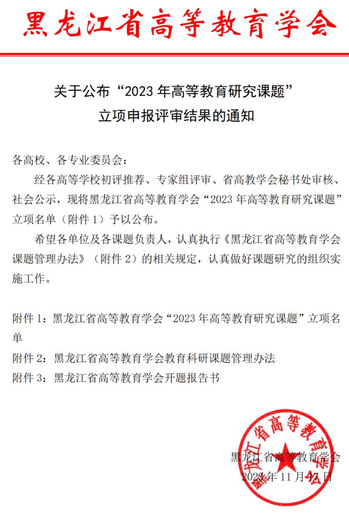 近日,黑龙江省高等教育学会公布“2023年高等教育研究课题”立项评审结果,学校赵婷婷申报的《东北抗联精神融入高校立德树人机制研究》等14项课题获批立项。