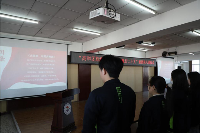 老团员干部代表为全体新团员佩戴了团徽,在团干部张思远的带领下,全体新团员庄严宣誓,老团员重温入团誓词。新团员们昂首挺胸,团徽在胸前闪耀。他们高举右拳,在鲜艳的团旗下,许下庄重的誓言。