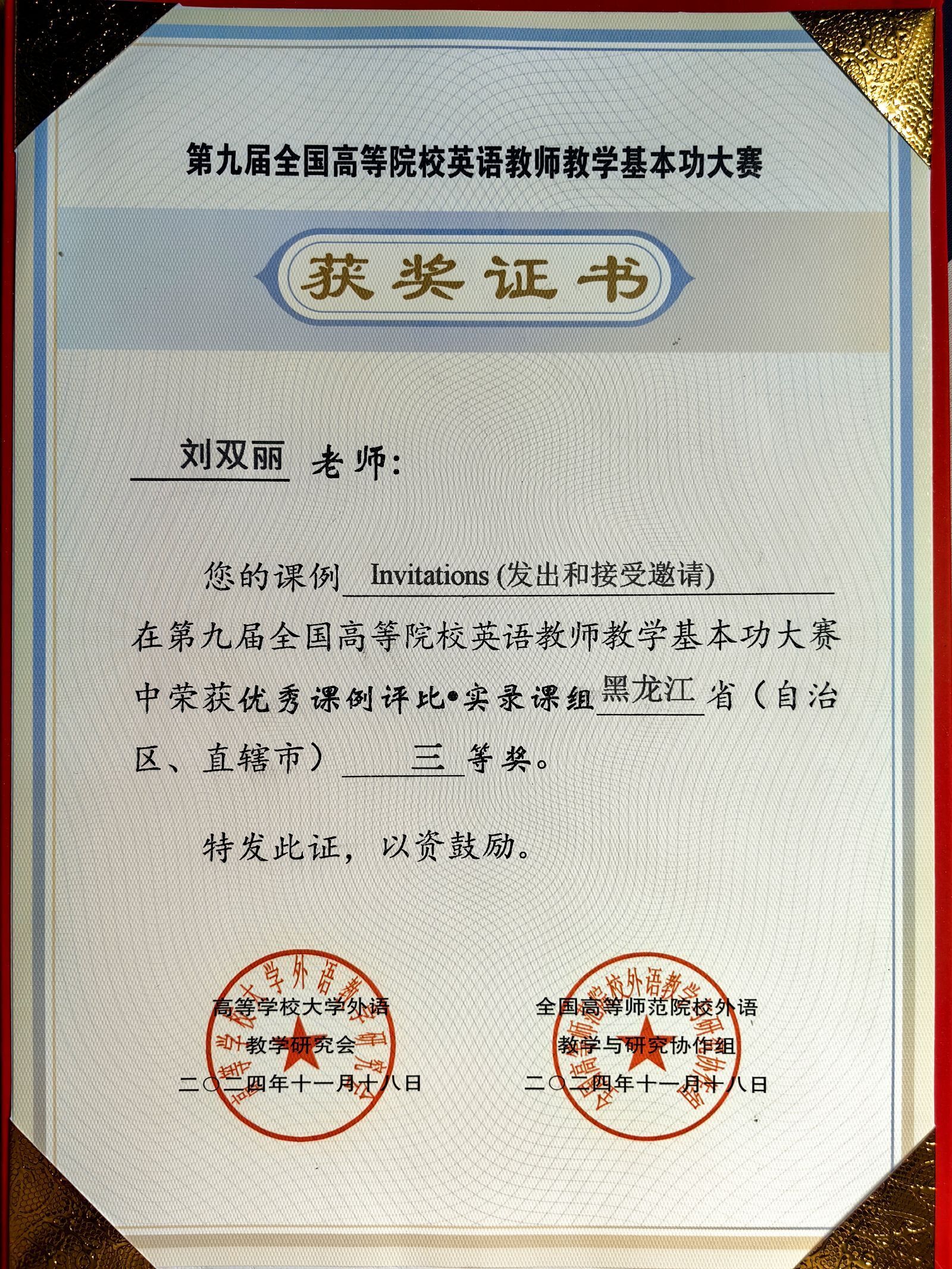 本次大赛是专门针对高校英语教师的全国性专项教学赛事,大学外语教研室教师积极参与。其中,孙德梅荣获优秀课例评比•说课省级二等奖,刘欢、马私阳、孙伟、曹献玲、鹿惠敏荣获优秀课例评比•说课省级三等奖,刘双丽、李爽和孙婷婷均荣获优秀课例评比•实录课省级三等奖,徐怡、齐锐教师团队荣获优秀课例评比•微课省级优秀奖。