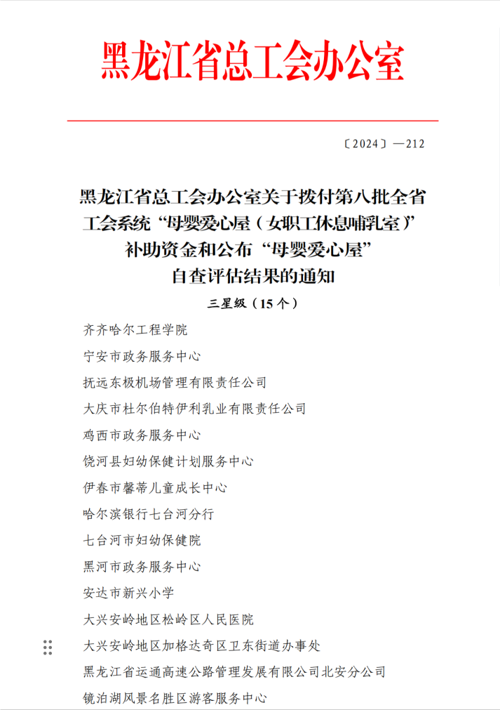 近日,黑龙江省总工会公布“母婴爱心屋”评估结果,学校获评2024年全省工会系统“三星级”母婴爱心屋(女职工休息哺乳室)。全省30家获评单位中,我校是唯一一所高校。