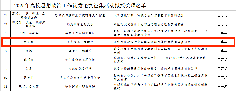 近日,教育部高校思想政治工作队伍培训研修中心(哈尔滨师范大学)主办的2025年高校思想政治工作优秀论文征集活动结果公布,土木与管理学院辅导员张天爱荣获三等奖。