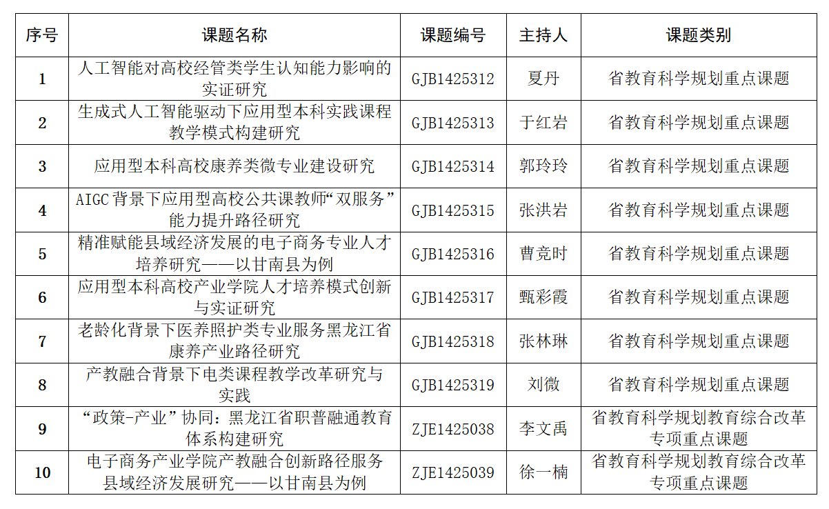 日前,黑龙江省教育科学规划领导小组公布2025年度省教育科学规划课题立项名单,我校成功获批10项重点课题,包括年度重点课题8项、教育综合改革专项课题2项。