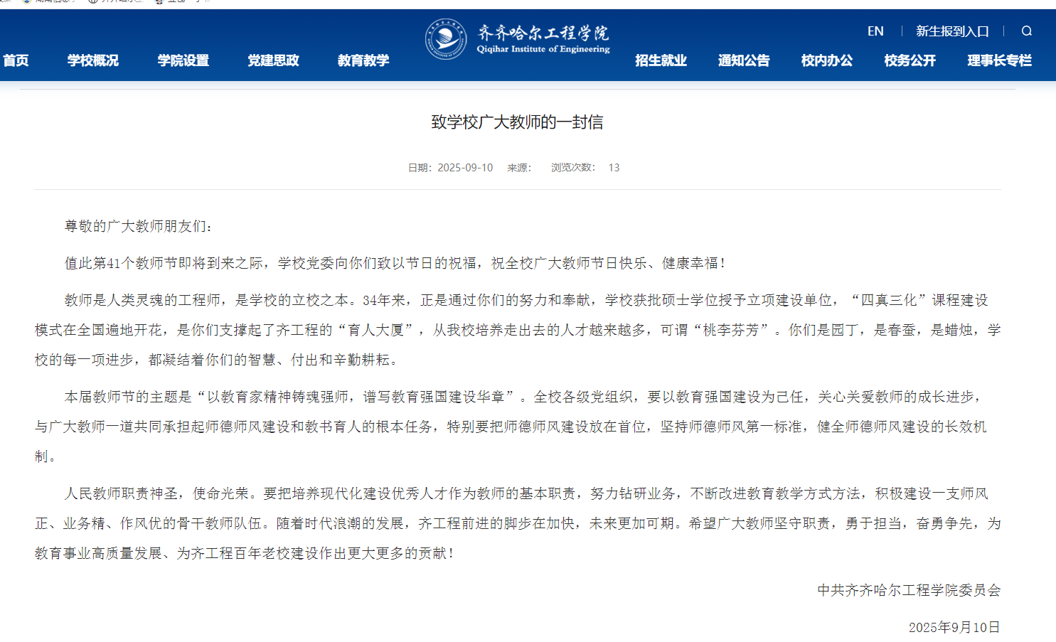 一纸慰问信:传递学校关怀,凝聚教师共识教师是人类灵魂的工程师是学校的立校之本。34年来,正是通过你们的努力和奉献,学校获批硕士学位授予立项建设单位‘四真三化’课程建设模式在全国遍地开花……”9月10日,学校党委向全体教师发出节日慰问信,字里行间满含敬意与感恩。慰问信中,系统回顾了过去一年全校教职工在教育教学、科研创新、管理服务、育人实践等领域的辛勤付出,肯定了教师队伍对学校发展的核心支撑作用。一纸慰问信,不仅为教师们送上了节日的诚挚祝贺与亲切问候,更让大家深刻感受到职业归属感与团队凝聚力进一步坚定了为学校发展、为教育事业拼搏的信念。