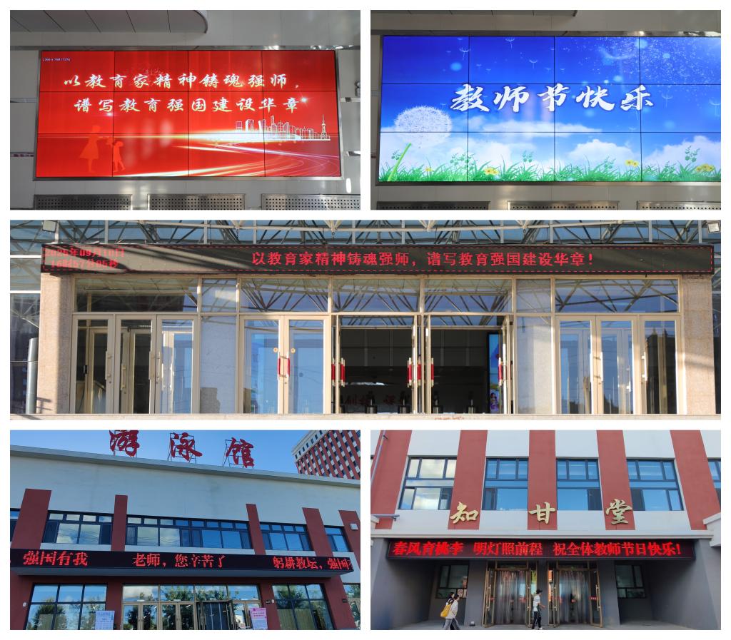 一次“亮灯”仪式:亮校园敬意,燃尊师之光学校9月9日10日,通过图书馆教学楼、产教融合基地等核心区域的电子显示屏,以滚动字幕形式开展“为教师亮灯”活动。字幕内容涵盖“青春引路人”“躬耕教坛、强国有我”“老师您好!”“教师节快乐”“弘扬教育家精神”等主题词让尊师重教的氛围渗透校园每个角落。明亮的字幕在夜色中格外醒目,不仅点亮了校园的夜晚,更将尊师重教的理念传递到每一位师生心中。