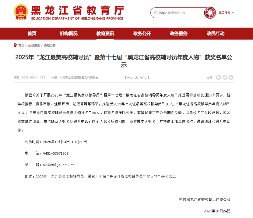 在2025年“龙江最美高校辅导员”暨第十七届“黑龙江省高校辅导员年度人物”推选展示活动中,学校机电学院辅导员王虹凭借出色的育人成效与深厚的教育情怀,经过严格的材料初评与现场答辩,荣获“黑龙江省高校辅导员年度人物”提名奖。这一荣誉的取得,是对她13年来坚守学生工作一线、倾心奉献、担当有为的最好肯定。