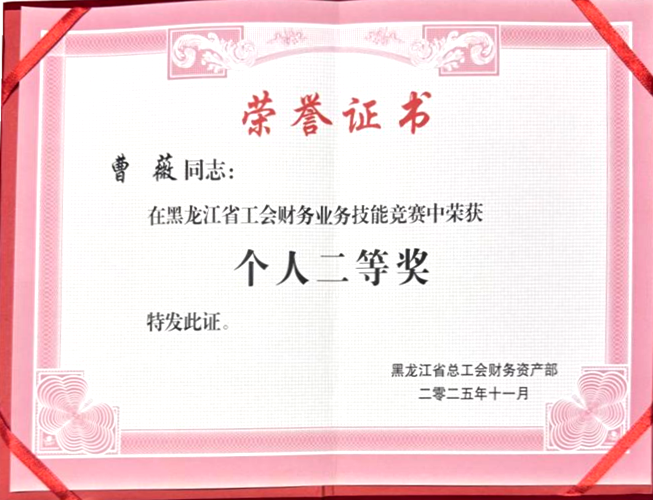 近日,黑龙江省总工会主办的全省工会财务知识竞赛在大庆市圆满落幕。我校产教集团会计曹薇凭借扎实的专业功底和出色的临场发挥,经过三天的激烈比拼,荣获个人二等奖;同时,她所在的市总工会团队也斩获团队二等奖,实现双料获奖的佳绩。此次竞赛充分展现了我校财务人员的专业素养与良好精神风貌。