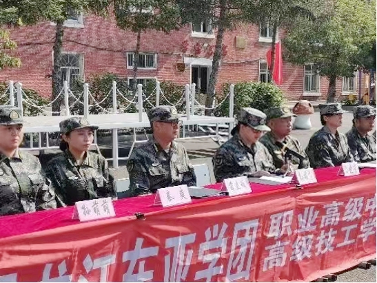 又讯 8月16日上午,东亚职业高中高级技工学校在学校操场召开2023级新生军训开营仪式。校党支部书记、常务副校长孙娱芯,副校长、综合办公室主任薛立峰,校长助理、教务处主任张丹,学生工作处主任陈占山、综合办公室主任助理秦爽、军训指导老师孙萌萌与军训教官参加开幕式,活动特邀齐齐哈尔工程学院教官团指导老师孙晓芳参加,学生工作处吴彦海老师主持。