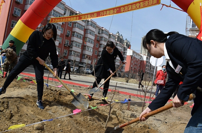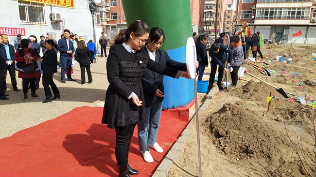 在鑫明园小区,白雪处长在划分给学院负责植树的区块插上标识牌,并与建筑系师生一起参加植树活动。大家热情高涨、干劲十足,在专业人员的指导下,两人一组,铲土、挖坑、栽苗、填土、浇水,共栽植了10棵沙果树、李子树。植树活动期间,土木152班张天浩同学还接受了市电视台记者采访。