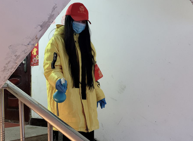 每天卡点值守工作完成后,黄卓同学还主动帮助社区进行防疫消毒,并且做得十分认真,每家每户的门把手她都不“放过”,她说:“这些工作都快成习惯了,每次从卡点回来,就从最外面的这个单元,一直消毒到自己家的单元,54户,一户都不能落下”。