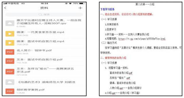 二是备足资源。我从学习通、中国大学慕课、中国知网等平台找到课程相关资源,给学生布置以自我为主角录制小视频的作业,最终作为教师进行再设计,其中融入两个元素:专业元素——本学期我主要面向汽服专业和英语专业学生教学,课程资源有意向专业融入,以更好地服务专业,如英语专业学生在“倾听交谈”模块需完成西方交谈礼仪的介绍;思政元素——语文课程也要发挥隐性育人作用,如汽服专业学生在“倾听交谈”模块,要围绕汽车营销、售后维修等岗位,从语言、着装等方面总结交谈礼仪,引导学生成为懂礼的合格职业人。同时,资源形式要多样,微视频、音频、课件、文档或者网址都能满足学生学习需求,避免学生学习过程中的视觉疲劳和学习倦怠。
