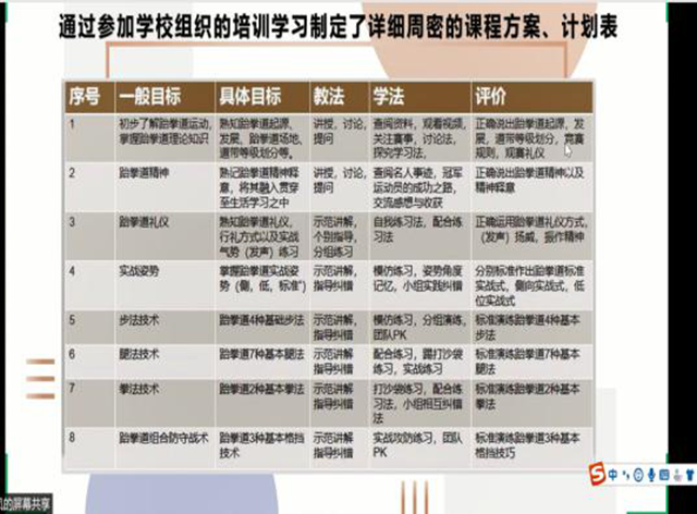 徐盼老师分享了自己在疫情防控期间主动请缨,积极投身社区疫情防控志愿服务,同时又将这种担当意识融入在线教学的课程思政中,以自身实践经历感染学生。还通过组织学生在线“吉尼斯”弹腿挑战赛,增强了自己的教学组织能力,激发了学生训练热情,提高了在线教学的有效性。